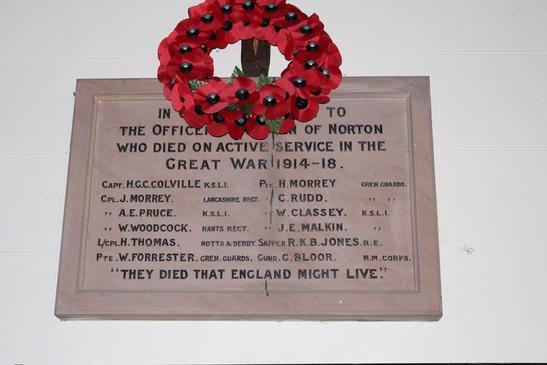 IN GRATEFUL MEMORY TO/ THE OFFICERS AND MEN OF NORTON/ WHO DIED ON ACTIVE SERVICE IN THE/ GREAT WAR 1914-1918/ (NAMES) "THEY DIED THAT ENGLAND MIGHT LIVE"