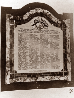 The chancel windows of this church were erected / in grateful memory of the men of this parish and congregation / who laid down their lives in the Great War. 1914-1918. / [names in 4 columns]