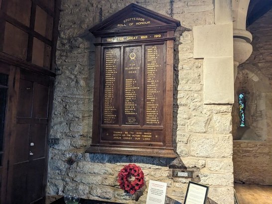 TOP OF BOARD: STOTTESDON / ROLL OF HONOUR / 1914 THE GREAT WAR 1919 MIDDLE OF BOARD: COLUMN ONE: 1914 / (NAMES) COLUMN TWO: OUR GLORIOUS DEAD / (NAMES) COLUMN THREE: 1915 / (NAMES) 1916 / (NAMES) / 1917 / (NAMES) / 1918 / (NAMES) BOTTOM OF BOARD: THANKS BE TO GOD WHICH / GIVETH US THE VICTORY THROUGH / JESUS CHRIST OUR LORD