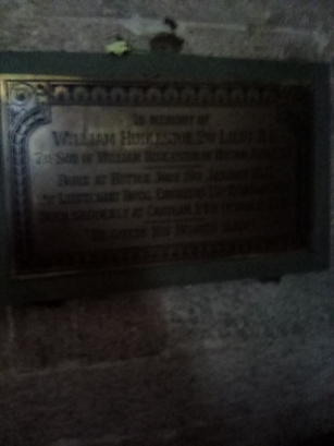IN MEMORY OF / WILLIAM HUDLESTON, 2ND LIEUT. R.E. / 7TH SON OF WILLIAM HUDLESTON OF HUTTON JOHN, C.S.I. / BORN AT HUTTON JOHN 19TH JANUARY 1871. / 2ND LIEUTENANT ROYAL ENGINEERS 13TH FEBRUARY 1891. / DIED SUDDENLY AT CHATHAM 24TH OCTOBER 1892. / "HE GIVETH HIS BELOVED SLEEP."