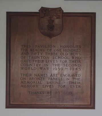 Board above fireplace: THIS PAVILION HONOURS/ THE MEMORY OF ONE HUNDRED/ AND FIFTY THREE OLD BOYS/ OF TAUNTON SCHOOL WHO/ GAVE THEIR LIVES FOR THEIR/ COUNTRY IN THE SECOND/ WORLD WAR 1939-1945/ THEIR NAMES ARE ENGRAVED/ ON BRONZE PANELS IN THE/ MEMORIAL SHRINE. THEIR/ MEMORY LIVES FOR EVER/ THANKS BE TO GOD Board above door: THIS PAVILION WAS OPENED ON 30TH MAY 1955/ BY FIELD MARSHAL SIR JOHN HARDING GCB CBE DSO MC CHIEF OF THE IMPERIAL GENERAL STAFF/ BEN S CLARK OBE JP/ PRESIDENT/ J G LEATHAM MA JP/ HEADMASTER
