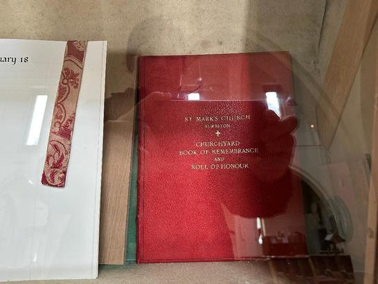 Front Cover- ST MARK'S CHURCH/SURBITON/CHURCHYARD/BOOK OF REMEMBRANCE/AND/ROLL OF HONOUR; Inside Pages- [names]