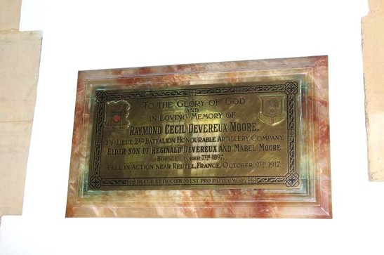 TO THE GLORY OF GOD / AND / IN LOVING MEMORY OF / RAYMOND CECIL DEVEREUX MOORE, / 2ND LIEUT. 2ND BATTALION HONOURABLE ARTILLERY COMPANY. / ELDER SON OF REGINALD DEVEREUX AND MABEL MOORE / BORN OCTOBER 7TH 1897. / FELL IN ACTION NEAR REUTEL, FRANCE, OCTOBER 9TH 1917. / DULCE ET DECORUM EST PRO PATRIA MORI