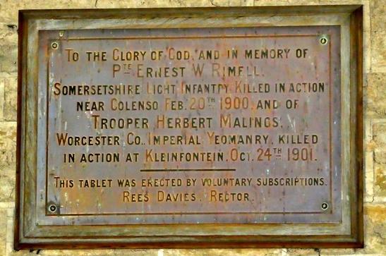 TO THE GLORY OF GOD AND IN MEMORY OF / PTE ERNEST W RIMELL, SOMERSHIRE LIGHT INFANTRY, KILLED IN ACTION / NEAR COLENSO FEB. 20TH.. 1900, AND OF / TROOPER HERBERT MALINGS, / WORCESTER CO., IMPERIAL YEOMANRY, KILLED / IN ACTION AT KLEINFONTEIN, OCT. 24TH.. 1901. / THIS TABLET WAS ERECTED BY VOLUNTARY SUBSCRIPTIONS. / REES DAVIES, RECTOR.