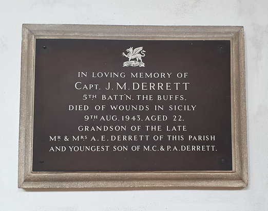 IN LOVING MEMORY OF / CAPT. J. M. DERRETT / 5TH BATT'N. THE BUFFS. / DIED OF WOUNDS IN SICILY / 9TH AUG. 1943, AGED 22. / GRANDSON OF THE LATE / MR AND MRS A. E. DERRETT OF THIS PARISH / AND YOUNGEST SON OF M.C. & P.A. DERRETT. //