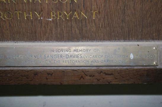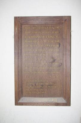 THE RESTORATION OF / THIS CHURCH WAS MADE / AS A THANKSGIVING TO / ALMIGHTY GOD FOR THE / VICTORY OF FREEDOM / OVER TYRANNY, AND THE / PRESERVATION OF THE / HOMES OF THE PARISH / AND TO COMMEMORATE / THOSE WHO DIED THROUGH / THE ACTION OF THE ENEMY / 1939 1945 / [NAMES]
