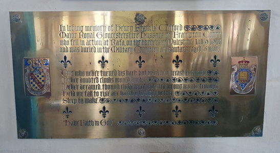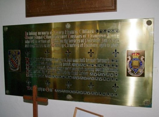 In loving memory of Henry Francis Clifford / Major Royal Gloucestershire Hussars of Frampton Court / who fell in action at Rafa, on the borders of Palastine, Jan 9 1917 / and was buried in the Military Cemetery at Kantara, aged 45 years / “One who never turned his back, but marched breast forward, / Never doubted clouds would break, / Never dreamed, though right were worsted, wrong would triumph. / Held we fall to rise, are baffled to fight better, / Sleep to make.” / "Have Faith in God" //