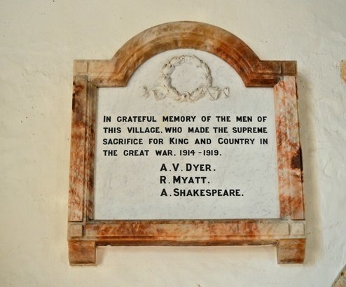 IN GRATEFUL MEMORY OF THE MEN OF / THIS VILLAGE WHO MADE THE SUPREME / SACRIFICE FOR KING AND COUNTRY IN / THE GREAT WAR, 1914-1919. / [NAMES]