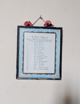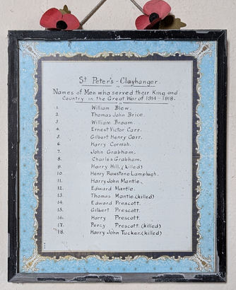 St. Peter's - Clayhanger. / Names of Men who served their King and / Country in the Great War of 1914 - 1918 / (18 NAMES)