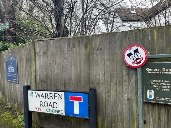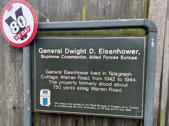 General Dwight D. Eisenhower, / Supreme Commander, Allied Forces Europe / General Eisenhower lived in Telegraph / Cottage, Warren Road, from 1942 to 1944. / This property formerly stood about / 750 yards along Warren Road. / This plaque was erected by the Royal Borough of Kingston Upon Thames / to commemorate the 50th anniversary of VE Day and VJ Day 1995