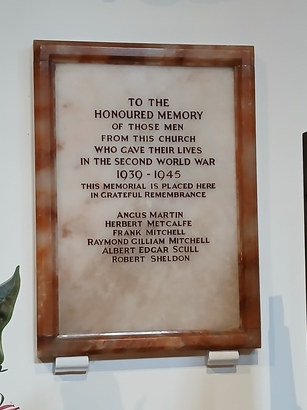 TO THE/ HONOURED MEMORY/ OF THOSE MEN/ FROM THIS CHURCH/ WHO GAVE THEIR LIVES/ IN THE SECOND WORLD WAR/ 1939-1945/ THIS MEMORIAL IS PLACED HERE/ IN GRATEFUL REMEMBRANCE/ (NAMES)