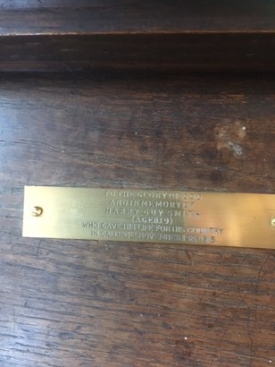 / TO THE GLORY OF GOD / AND IN MEMORY OF / HARRY GUY SMITH / (AGED 19) / WHO GAVE HIS LIFE FOR HIS COUNTRY / IN GALLIPOLI NOVEMBER 14th 1915 /