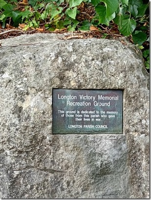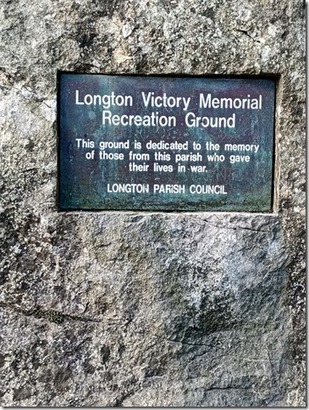 Sign at the top of the entrance road: Longton Victory Memorial/ Recreation/ Ground/ Est: 1922/ (Descriptions of activities etc)/ A living memorial to all those from the Parish who fought for their country On the wall opposite: Longton VM/ Est: 1922/ Victory Lane On the plaque on the nearby granite stone: Longton Victory Memorial/ Recreation Ground/ This ground is dedicated to the memory/ of those from this parish who gave/ their lives in war./ Longton Parish Council