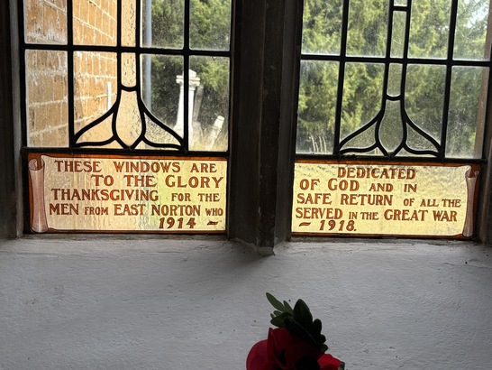 Window: THESE WINDOWS ARE DEDICATED/ TO THE GLORY OF GOD AND IN/ THANKSGIVING FOR THE SAFE RETURN OF ALL THE/ MEN FROM EAST NORTON WHO SERVED IN THE GREAT WAR/ 1914 - 1918./ Plaque: East Norton/ 1914-2014/ "A Thankful Village"
