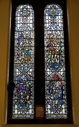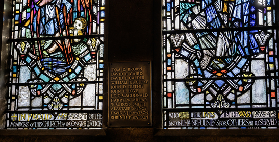On the glass: IN PROUD MEMORYOF THE MEMBERS OF THIS CHURCH and CONGREGATION > WHO GAVE THEIR LIVES IN THE WAR 1939-45> and in THANKFULNESS for OTHERS who SERVED