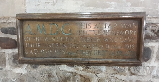 Plaque: A.M.D.G. / THIS ALTAR WAS / ERECTED IN MEMORY / OF THE MEN OF THIS PARISHWHO GAVE / THEIR LIVES IN THE WARS A.D. 1914 -1918 / & A.D. 1939 - 1945. MAY THEY REST IN PEACE.