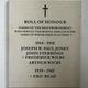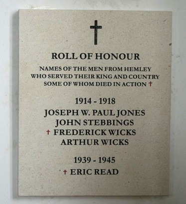 (cross)/ROLL OF HONOUR/NAMES OF THE MEN FROM HEMLEY/WHO SERVED THEIR KING AND COUNTRY/SOME OF WHOM DIED IN ACTION (CROSS)/ 1914 - 1918/(Names)/1939 - 1945/(Names)/