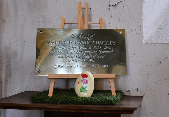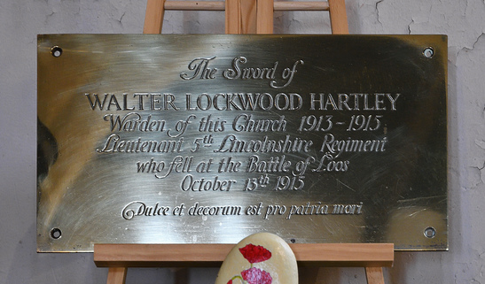 The Sword of/ WALTER LOCKWOOD HARTLEY/ Warden of this Church 1913-1915/ Lieutenant 5th Lincolnshire Regiment/ who fell at the Battle of Loos/ October 13th 1915/ Dulce et decorum est pro patria mori
