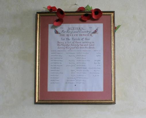 1914 SUFFOLK 1918 / FOR KING AND COUNTRY / THE ROLL OF HONOUR / FOR THE PARISH OF HOO / BEING A LIST OF THOSE SERVING IN / HIS MAJESTY'S FORCES BY SEA AND LAND / DURING THE GREAT WAR FROM THIS PARISH/ SURNAME . CHRISTIAN NAME . . SERVING IN + SURNAME . CHRISTIAN NAME . .. SERVING IN : / [NAMES]