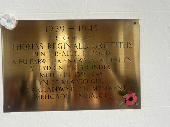 1939-1945 THOMAS REGINALD GRIFFITHS PEN-YR-ALLT, NERQUIS A FU FARW TRA YN GWASANEATHU YN Y FYDDIN YN YR INDIA MEHEFIN 13ES 1945 YN 23 MLWYDD OED AC A GLADDWYD YN MYNWENT MEHGAON, INDIA, CP