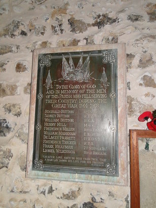 TO THE GLORY OF GOD / AND IN THE MEMORY OF THE MEN / OF THIS PARISH WHO FELL SERVING / THEIR COUNTRY DURING THE / GREAT WAR / 1914-1918 / (Names) / "GREATER LOVE HATH NO MAN THAN THIS THAT / A MAN LAY DOWN HIS LIFE FOR HIS FRIENDS" / ST JOHN XV 13