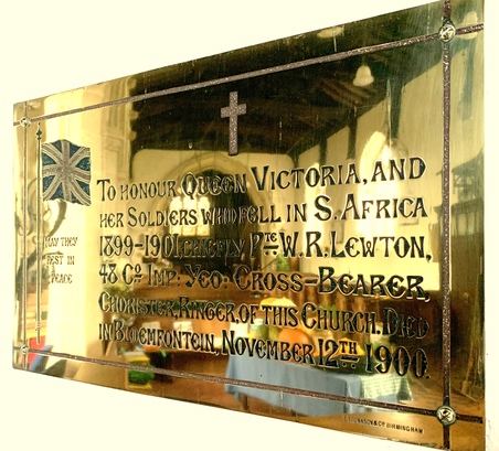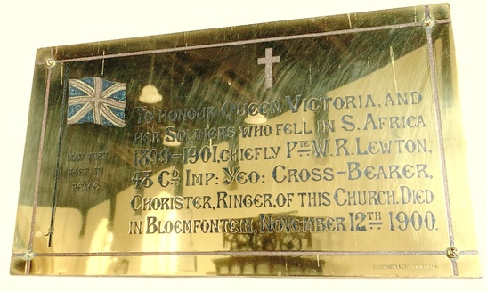 MAY THEY REST IN PEACE/TO HONOUR QUEEN VICTORIA, AND/HER SOLDIERS WHO FELL IN SOUTH AFRICA 1899 - 1901, CHIEFLY PRIVATE W.R. LEWTON,/48 COMPANY IMPERIAL YEOMANRY: CROSS-BEARER,/CHORISTER, RINGER, OF THIS CHURCH. DIED/IN BLOEMFONTAINE, NOVEMBER 12TH 1900.