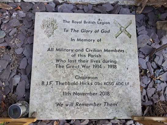 The Royal British Legion to the glory of God In memory of all military and civilian members of this parish who lost their lives during the Great War 1914-1918 Chairman B J F Theobald-Hicks OStJ KCSG ADF LF 11th November 2018 "we will remember them"