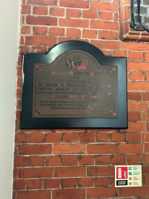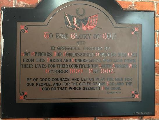 TO THE GLORY OF GOD/AND/IN GRATEFUL MEMORY OF/THE OFFICERS, NON-COMMISSIONED OFFICERS AND MEN/FROM THIS PARISH AND CONGREGATION WHO LAID DOWN/THEIR LIVES FOR THEIR COUNTRY IN THE SOUTH AFRICAN WAR/OCTOBER 1899-MAY 1902//BE OF GOOD COURAGE, AND LET US PLAY THE MEN FOR/OUR PEOPLE, AND FOR THE CITIES OF OUR GOD: AND THE LORD DO THAT WHICH SEEMETH HIM GOOD/2.SAM: X.12.