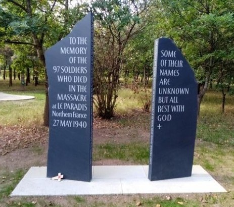 Left - To the Memory of the 97 soldiers who died in the massacre of Le Paradis, Northern France 27 May 1940. Right - Some of their names are unknown but all rest with God.