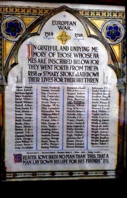 EUROPEAN WAR/1914 1918/ IN GRATEFUL AND UNDYING ME-/ MORY OF THOSE WHOSE NA-/ MES ARE INSCRIBED BELOW; FOR/ THEY WENT FORTH FROM THE PA-/ RISH OF ST MARY STOKE AND LAID DOWN/ THEIR LIVES FOR THEIR BRETHREN/ (Names)/ "GREATER LOVE HATH NO MAN THAN THIS, THAT A/ MAN LAY DOWN HIS LIFE FOR HIS FRIENDS" ST JOHN XV, XIII
