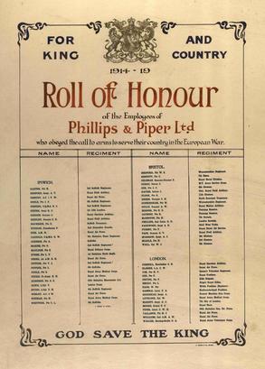 FOR KING AND COUNTRY/1914-19/Roll of Honour/of the Employees of/Phillips & Piper Ltd./who obeyed the call to arms to serve their country in the European War/(Names)/GOD SAVE THE KING//