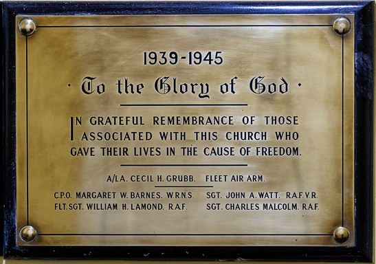 1939 - 1945> To the Glory of God> In GRATEFUL REMEMBRANCE OF THOSE> ASSOCIATED WITH THIS CHURCH WHO> GAVE THEIR LIVES IN THE CAUSE OF FREEDOM.> NAMES>