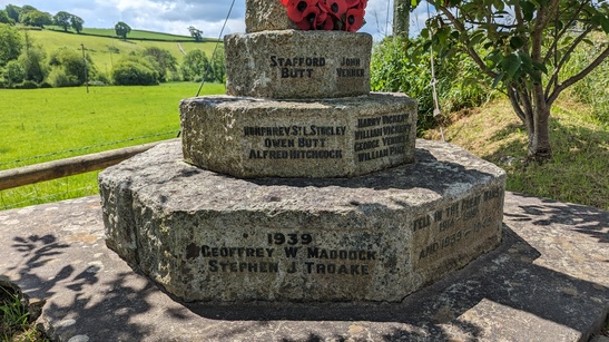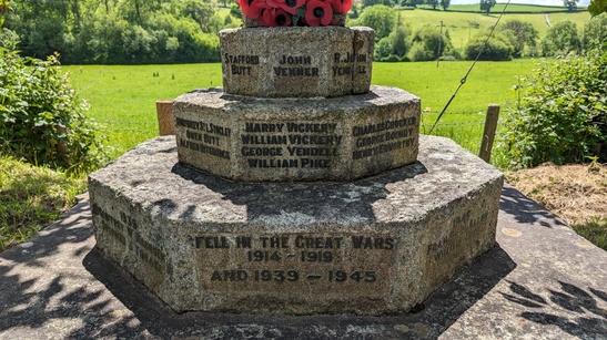 3 top frontal step faces : (3 NAMES) / 3 middle frontal step faces : (10 NAMES) / 6 o'clock, [centre] bottom step face : FELL IN THE GREAT WAR / 1914 - 1918 / AND 1939 - 1945 7.30, bottom step face : 1939 / (2 NAMES) 4.30, bottom step face : 1945 / (2 NAMES)