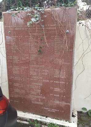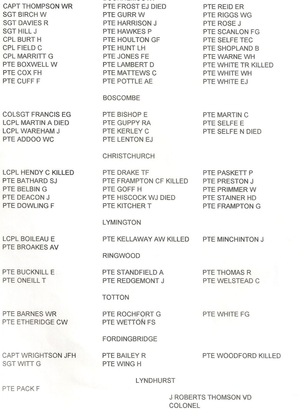 See photograph of list of names who served, but those killed are as follows. Pte E J Frost; Pte T R White; Lcpl A Martin; Pte N Selfe; Lcpl C Hendry; Pte C F Frampton; Pte W J Hiscock; Pte A W KIellaway; Pte Woodford