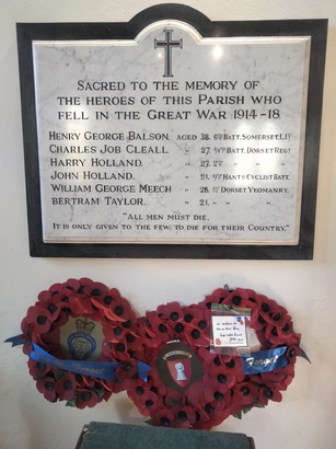 Henry George Balson Aged 38 6th Batt. Somerset L Iy./ Charles Job Cleall Aged 27 2.4th Batt. Dorset Regt/ Harry Holland Aged 27 2nd Batt. Dorset Regt/ John Holland Aged 21 9th Hants Cyclist Batt./ William George Meech Aged 28 1st Dorset Yeomanry/ Bertram Taylor Aged 21 1st Dorset Yeomanry