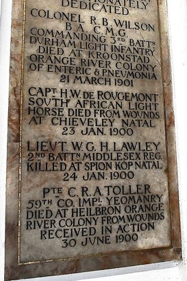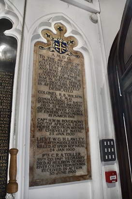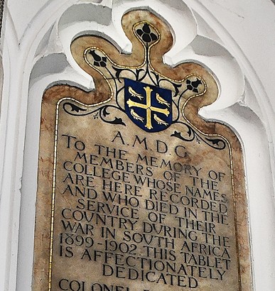 A.M.D.G. / TO THE MEMORY OF / MEMBERS OF THE / COLLEGE WHOSE NAMES / ARE HERE RECORDED / AND WHO DIED IN THE / SERVICE OF THEIR / COUNTRY DURING THE / WAR IN SOUTH AFRICA / 1899 - 1902. THIS TABLET / IS AFFECTIONATELY / DEDICATED / (4 NAMES)