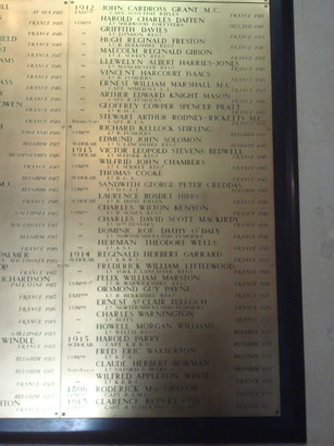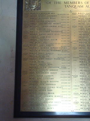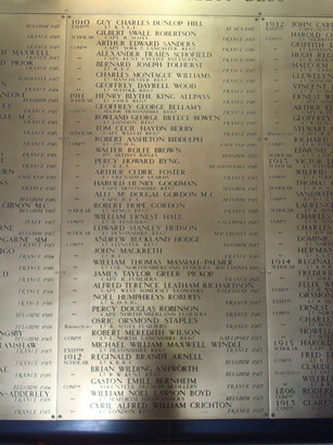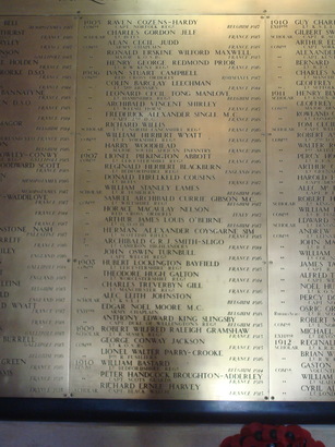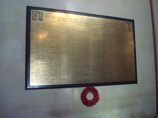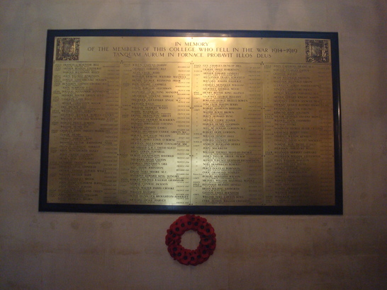 N MEMORY OF THE MEMEBERS OF THIS COLLEGE/ WHO FELL IN THE WAR 1914 - 1919/ (Names)/TANQUAM AURUM IN FORNACE PROBAVIT ILLOS DEUS ('God tried them as gold in the furnace')
