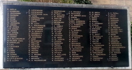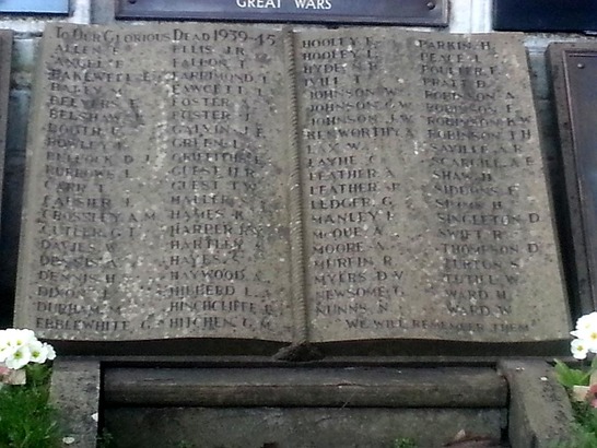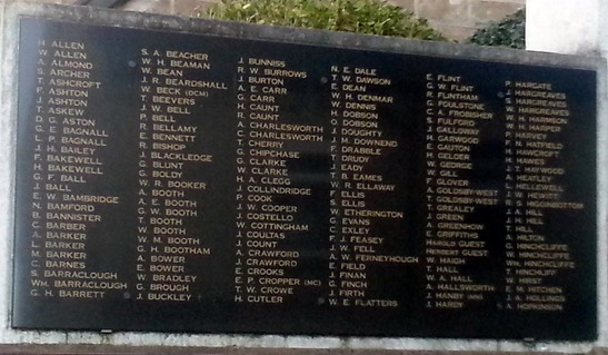 [WW1] H Allen, W Allen, A Almond, S Archer, T Ashcroft, F Ashton, J Ashton, T Askew, D G Aston, G E Bagnall, L P Bagnall, J H Bailey, F Bakewell, H Bakewell, G F Ball, J Ball, E W Bambridge, N Bamford, B Bannister, C Barber, A Barker, L Barker, M Barker, C Barnes, S Barraclough, Wm Barraclough, G H Barrett, S A Beacher, W H Beaman, W Bean, J R Beardshall, W Beck (DCM), T Beevers, J W Bell, P Bell, R Bellamy, E Bennett, R Bishop, J Blackledge, G Blunt, G Boldy, W R Booker, A Booth, A E Booth, G W Booth, T Booth, W Booth, W M Booth, G H Bootham, A Bower, E Bower, W Bradley, G Brough, J Buckley, J Bunniss, R W Burrows, J Burton, A E Carr, G Carr, H Caunt, R Caunt, A Charlesworth, C Charlesworth, T Cherry, G Chipcase, G Clarke, H A Clegg, J Collindridge, P Cook, J W Cooper, J Costello, W Cottingham, J Coultas, J Count, A Crawford, J Crawford, E Crooks, E P Cropper (MC), T W Crowe, H Cutler, N E Dale, T W Dawson, E Dean, W H Denmar, W Dennis, H Dobson, O Dobson, J Doughty, J M Downend, F Drabble, T Drudy, J Eady, T B Eames, W R Ellaway, F Ellis, S Ellis, W Etherington, G Evans, C Exley, F J Feasey, J W Fell, A W Ferneyhough, E Field, J Finan, G Finch, J Firth, W E Flatters, E Flint, G W Flint, R Flintham, G Foulstone, C A Frobisher, S Fulford, J Galloway, H Garwood, E Gauton, H Gelder, W George, W Gill, F Glover, A Goldsby-West, T Goldsby-West, T Grealey, J Green, A Greenhow, E Griffiths, Harold Guest, Herbert Guest, W Haigh, T Hall, W A Hall, A Hallsworth, J Hanby (MM), J Hardy, P Hargate, J Hargreaves, S Hargreaves, W Hargreaves, W H Harmson, W H Harper, P Harvey, F N Hatfield, H Hawcroft, H Hawes, J T Haywood, A Heatley, L Hellewell, J W Hewitt, R S Higginbottom, J A Hill, J H Hill, T Hill, A Hilton, G Hinchcliffe, W Hinchcliffe, Wm Hinchcliffe, T Hinchliff, W Hirst, E M Hitchen, J A Hollings, A Hopkinson, E Hoyle, J Hubbard, A Huckerby, R Hudson, (Raymond Hudson) H Hunt, E Hyde, E Hydes, M Johnson, E Jones, F W Jones, J H Jones, W Jones, Wm Jones, T Kenvin, W Kerry, R A Killingreay, B Kilner (MSM), E Knowles, F Lax, C Leather, J Lee, F Lees, H Lees, W Lewis, W Lindley, A Littlewood, H G Lloyd, A Lockwood, E Lockwood, T Lockwood (DCM), W Long, J Longfellow, J Lotwick, J Lowe, J W Luty, R L Mackridge, W Mallinder, C Mallinson, W H Manley, C Marshall, S Marshall, W Masters, F Maw, J McGuigan, J Mellor, S Mellor, F Milburn, C Minett, B Moore, E Moore, G V Moore, J Moore, J Moores, H D Moorhouse, J Moorhouse, H Morley, F M Mullins, J W Murray, A Naylor, J Naylor, J Newberry, H Nixon, J A Noble, E Nuttall, E Nutter, E Oliver, W Oliver, R Outram, J W Page, G W Parkin, H Parkin, J Parsons, H Peace, T Pearce, F Pettitt, H Pettitt, S Pittam, C P Pollard, A Priest, H Radford, S Ramsden, J C Rhodes, E Richards, J W Rimmer, F Rispin, R A Robey, Albert Robinson, Alfred Robinson, C A Robinson, T Robinson, H Rowe, J E Russell, A Ryman, A Sager, E Sanderson, A E Scott, M Scott, R Scott, J Shannon, P Shannon, E R Sharman, W Sharman, J Shepherd, H Sims, E Skews, W Skidmoore, H Skinner, C Smith (MM), G W Smith, H W Smith, J S Smith, L Smith, T Smith, S Sokell, C H Standish, E Steele, W E Steele, G Stevens, J Swain, F Swift, G E Swift, G Swindells, G W Taylor, A Taylor, J Taylor, A Thickett, J E Thompson, A Thorning, E Thorpe (MM), T E Thornton, S Tomlinson, W E Tomlinson, J Tonks, A Townsend, C Turton, A C Tutill, A Utley, J Utley, J Vaughan, R Vaughan, H Vickers, R Waite, A Walker, E A Walker, F Walker (RN), F Walker (Y&L), H Walton, F Ward, J W Ward, C Waterson, A Watkin, J Webster, R Whitehead, W Whitehead, G Wigglesworth, C Williams, G Williams, A B Winder, F Wood, H Wood, A Wright, J Wright. [WW2] Allen F, Angel E, Bakewell E, Batty M, Beevers F, Belshaw J, Booth C, Bowley I, Bullock D J, Burrows L, Carr T, Causier J, Crossley A M, Cutler G T, Davies W, Dennis A, Dennis H, Dixon J, Durham M, Ebblewhite G, Ellis J R, Fallon T, Farrimond L, Fawcett J, Foster A, Foster J, Galvin J F, Green L, Griffiths E, Guest H R, Guest T W, Haller S, Hames K, Harper R Y, Hartley A, Hayes S, Haywood A, Hibberd L, Hinchcliffe E, Hitchen G M, Hooley F, Hooley L, Hyde N B, Ivill T, Johnson W, Johnson G W, Johnson J W, Kenworthy A, Lax W, Layhe C, Leather A, Leather J, Ledger G, Manley I, McQue A, Moore A, Murfin R, Myers D V, Newsome G, Nunns N , Parkin H, Peace L, Poulter F, Pratt D, Robinson A, Robinson F, Robinson K W, Robinson T H, Saville A R, Scargill A E, Shaw H, Siddons F, Simms H, Singleton D, Swift R, Thompson D, Turton S, Tutill W, Ward H, Ward W,
