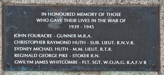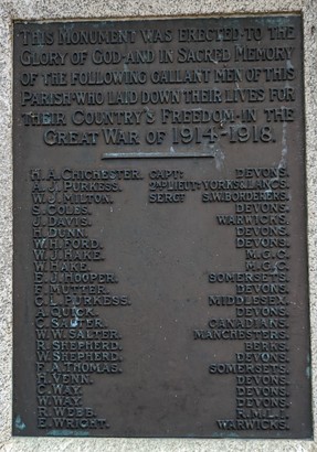 H.A. Chichester. Capt: Devons, A.J. Purkess. 2nd Lieut: Yorks & Lancs. W.J. Milton. Sergt:S.W. Borderers. S. Coles. Devons. J. Davis. Warwicks. H. Dunn. Devons. W.H. Ford. Devons. W.J. Hake. M.G.C. W. Hake. M.G.C. E.J. Hooper. Somersets. F. Mutter. Devons. C.L. Purkess. Middlesex. A. Quick. Devons. C. Salter. Canadians. W.W. Salter. Manchesters. R. Shepherd. Berks. W. Shepherd. Devons. F.A. Thomas. Somersets. H. Venn. Devons. C. Way. Devons. W. Way. Devons. R. Webb. R.M.L.I. E. Wright. Warwicks. WWII - John Fouracre - Gunner M.R.A. Christopher Raymond Huth - Sub. Lieut. R.N.V.R. Sydney Michael Huth - M.M. Lieut. R.T.R. Reginald George Pike - Stoker R.N. Gwilym James Whitcombe - Flt. Sgt. W.O./A.G. R.A.F. V R