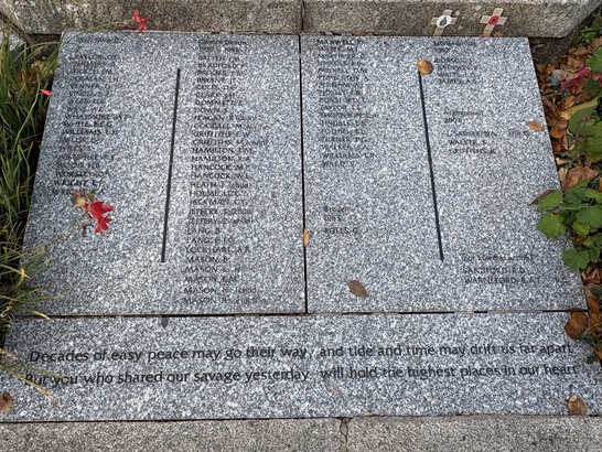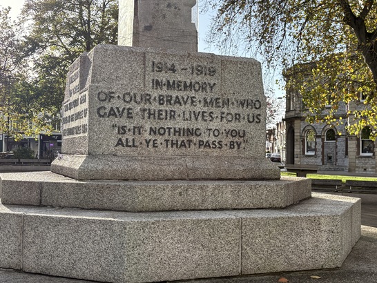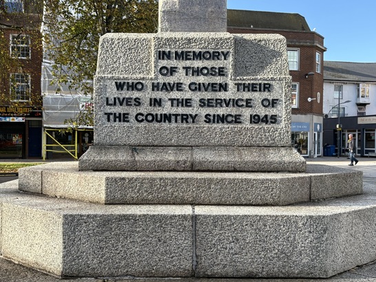 (face 1) 1914 - 1919 / IN MEMORY / OR OUR BRAVE MEN WHO / GAVE THEIR LIVES FOR US / 'IT IS NOTHING TO YOU / ALL YE THAT PASS BY.' (face 2) 1939-1945 / 'WE WILL REMEMBER THEM.' (face 3) IN MEMORY / OF THOSE / WHO HAVE GIVEN THEIR / LIVES IN THE SERVICE OF / THE COUNTRY SINCE 1945.