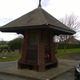 A our sided shelted with tiled roof, seats and name panels on each of the sides.